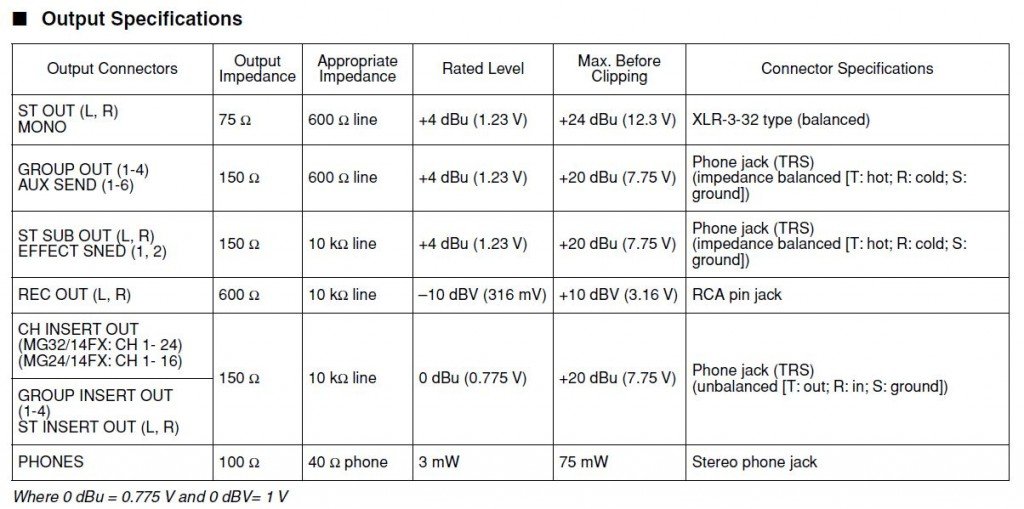 A common mixer used in churches and schools is the Yamaha MG series. Its specifications are also representative of many mixers. A quick glance at the specifications reveal both dBu and dBV are used. However at the bottom of the page, they do conveniently state that 0dBu=0.775 volts and 0dBV=1 volt. They also helpfully give the equivalent voltages alongside each dB value. Let’s look at some of the specifications that will interest us if we want to connect to a mixer output.
